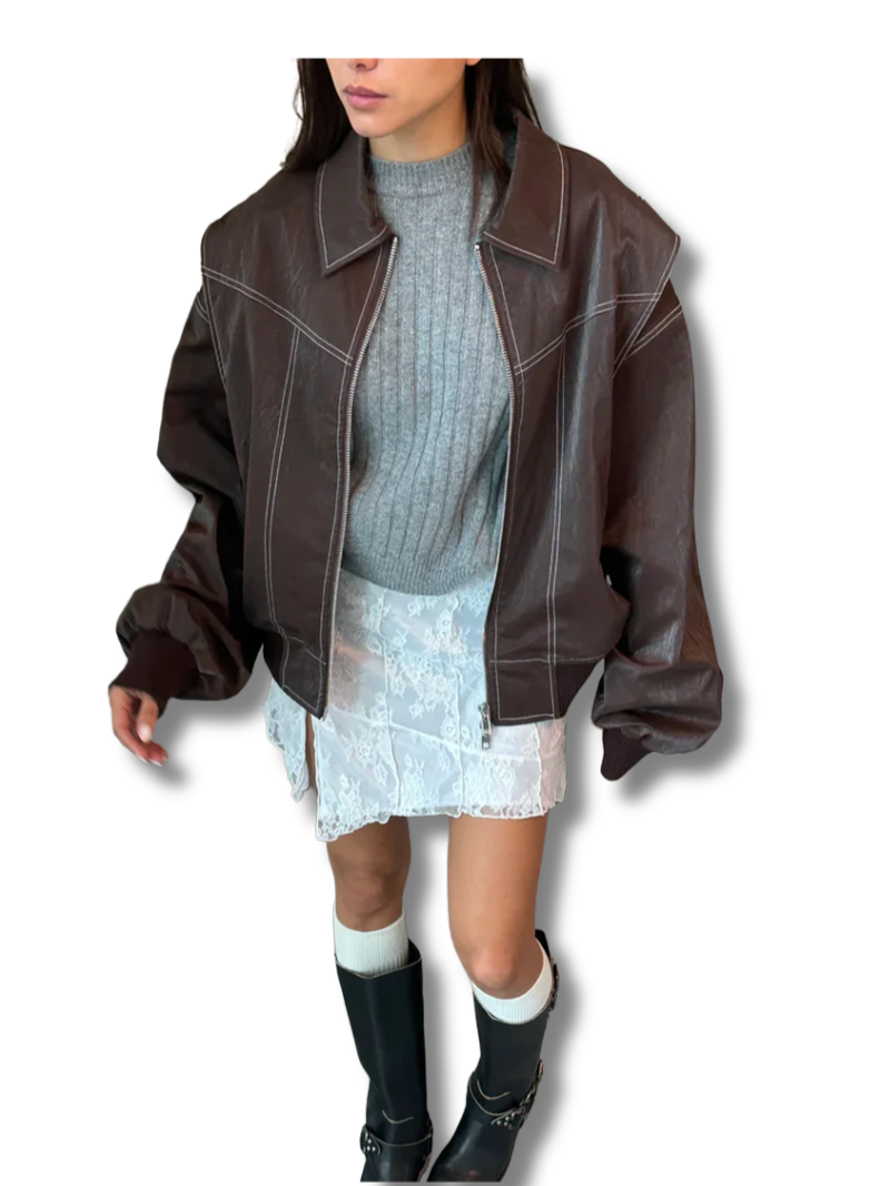 This oversized jacket, featuring bold contrast stitching, is the essential statement piece for autumn. Available in rich red, warm brown, classic black, and deep green, it combines a laid-back fit with a stylish edge—ideal for those cooler days.