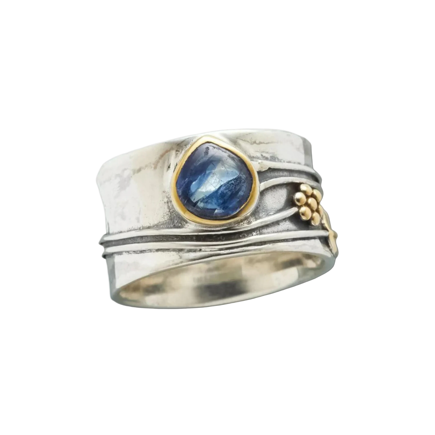 Design: Wide handmade ring featuring a blue gemstone