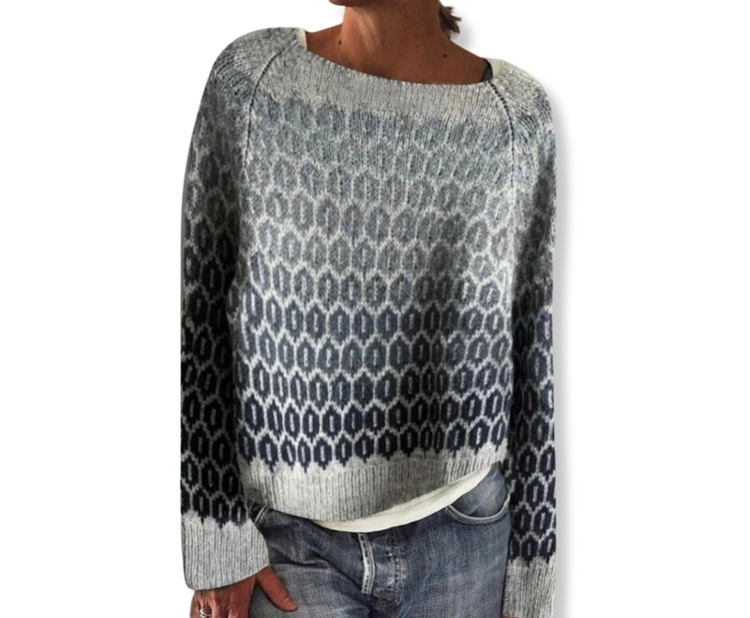 The Bianca – Ombré Knit Jumper offers a chic balance of simplicity and statement. Its gradient grey base blends seamlessly into a striking dark geometric pattern, creating a refined yet eye-catching design. The relaxed silhouette and wide neckline give it an effortless feel, while the soft knit texture ensures warmth and comfort without heaviness. A versatile piece that works just as well for laid-back weekends as it does for polished casual looks.